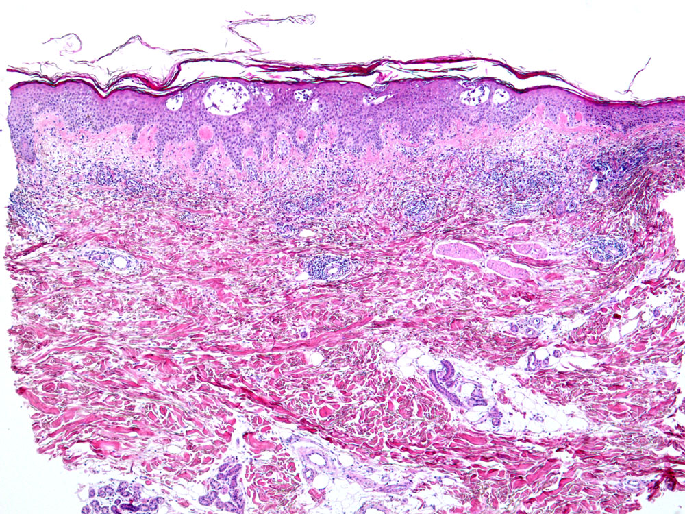 Geringgradige irreguläre Akanthose der Epidermis. Epidermis und papilläre Dermis erscheinen aufgrund des Ödems relativ hell. Intraepidermale Spongiosebläschen. Schuppenkruste. Oberflächliches perivaskulär betontes Entzündungsinfiltrat.