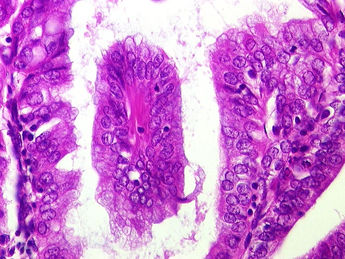 Proliferierte Drüsen mit mehrrehigem Epithel mit mässig ausgeprägter Atypie. Die Kerne sind abgerundet und vergrössert mit Verschiebung der Kern-Zytoplasma Relation zugunsten des Kernes. Das Chromatin ist granulär. Die Zellkernpolymorphie ist relativ gering, grosse Nukleolen fehlen.