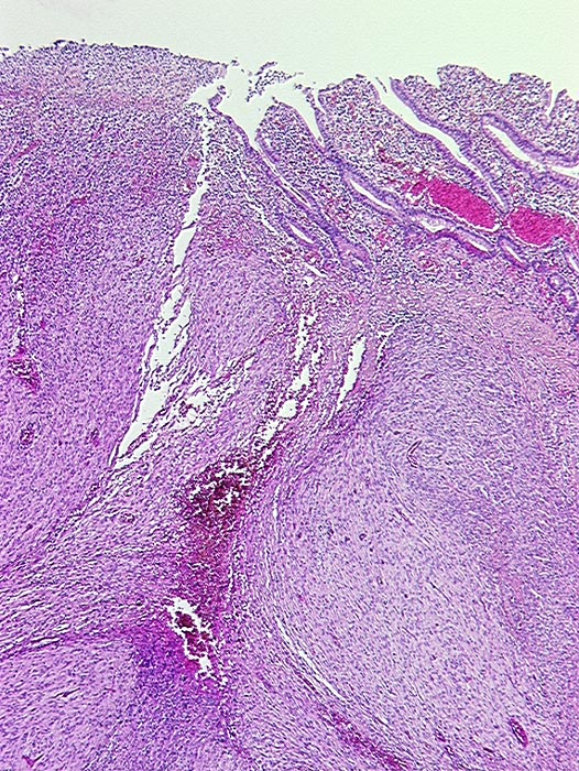 Spindelzelliger von der Submukosa ausgehender Tumor. Links im Bild ist die Schleimhaut exulzeriert.