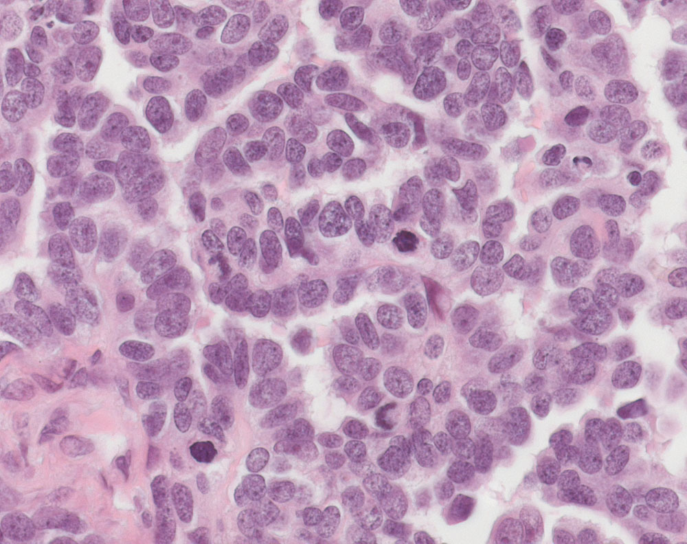 Drüsen mit schlitzförmigen Lumina ausgekleidet von stark atypischen hyperchromatischen pleomorphen Zellen mit ausgeprägten Grössenschwankungen. Mehrere Mitosen.