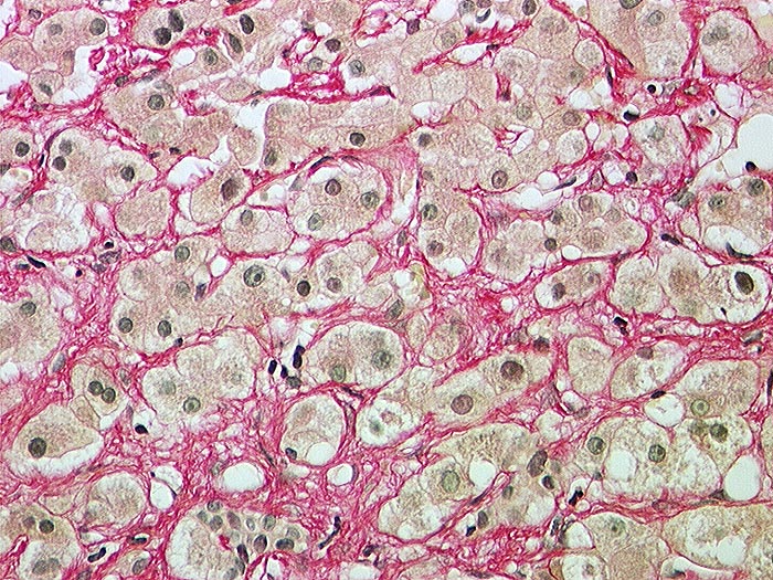 Die Hepatozyten sind von einem feinen bindegewebigen Maschenwerk umgeben.