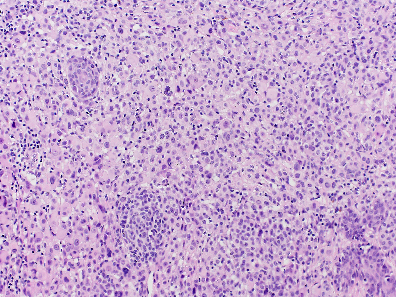 Biphänotypischer Naevus mit einer kleinzelligen gewöhnlichen Naevuskomponente durchmischt mit einer atypischen epitheloidzelligen Komponente. Die atypische Epitheloidzellkomponente besteht aus grossen Melanozyten mit reichlich glasigem Zytoplasma, klar definierten Zellgrenzen und grossen, vesikulären, leicht pleomorphen Zellkernen mit prominenten eosinophilen Nukleolen. An einigen Stellen sind tumorinfiltrierente Lymphozyten erkennbar.