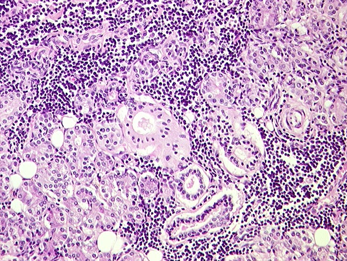 Chronische lymphozytäre Entzündung und Atrophie der Glandula parotis.