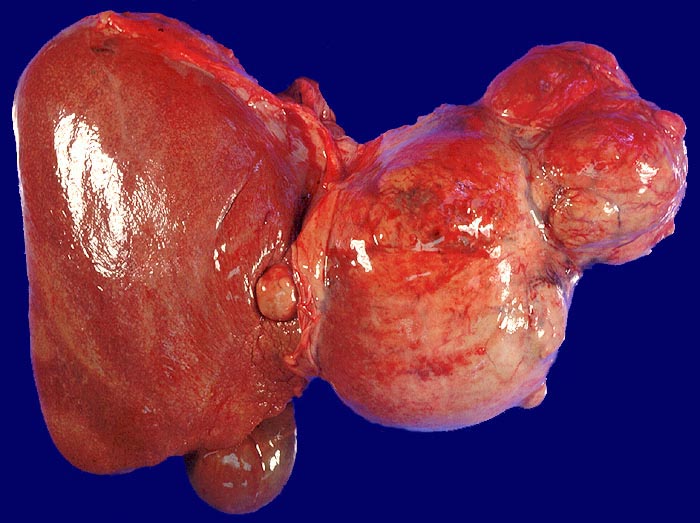 Der gut vaskularisierte Tumor infiltriert den gesamten linken Leberlappen.