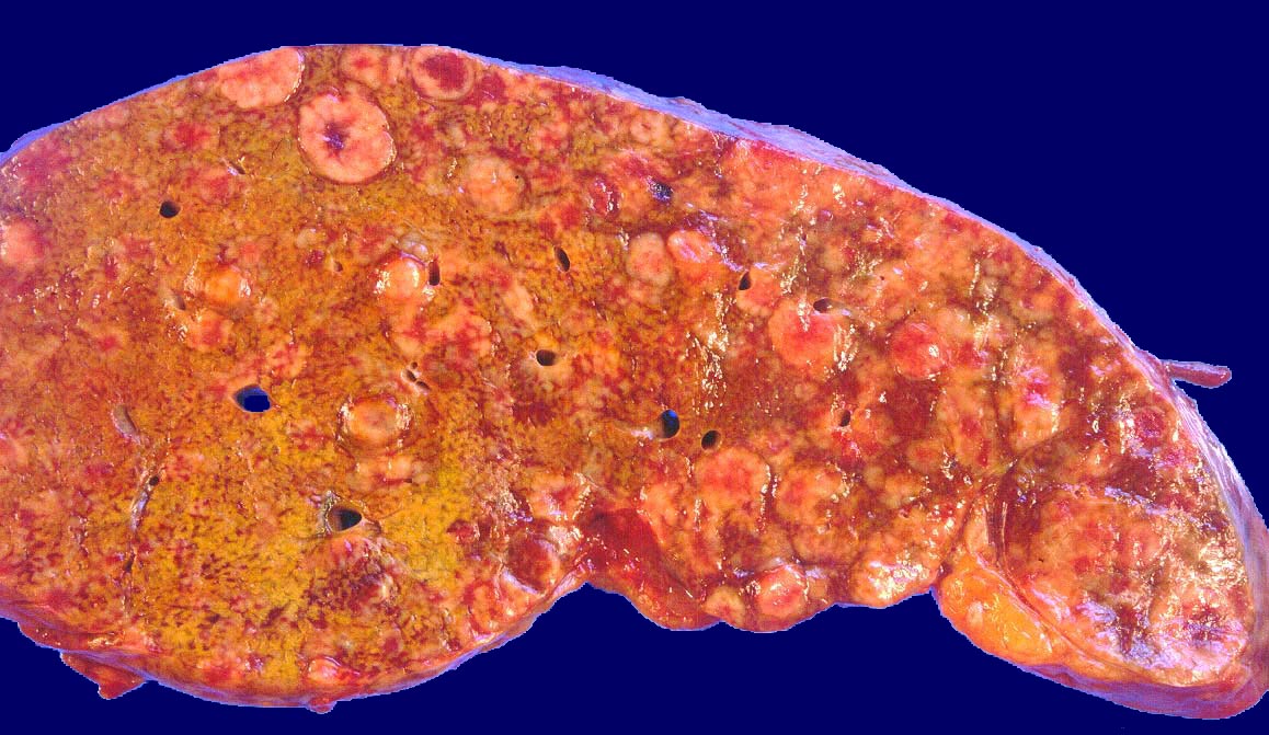 Die Leber hat aufgrund der tumorbedingten Cholestase eine grünliche Farbe. Zahlreiche konfluierende runde Metastasen.