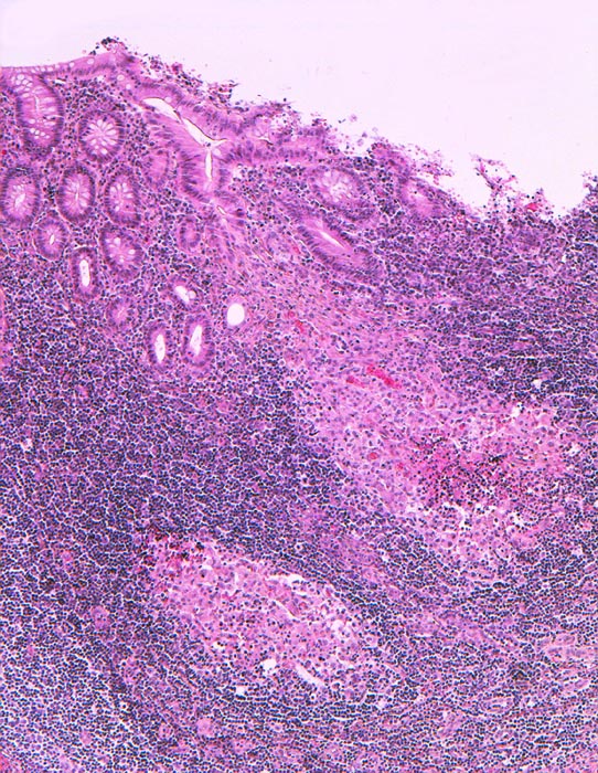 Ansammlung von Histiozyten mit zentraler granulozytärer Abszedierung im Stroma der Mucosa. Das Epithel ist intakt.