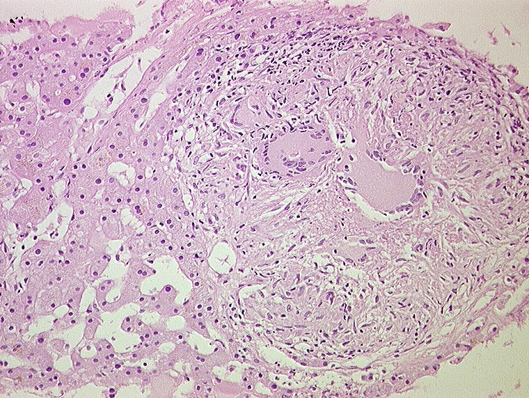 Nicht verkäsendes produktives Granulom aus Epitheloidzellen und Langhans'schen Riesenzellen mit hufeisenförmig angeordneten Kernen.