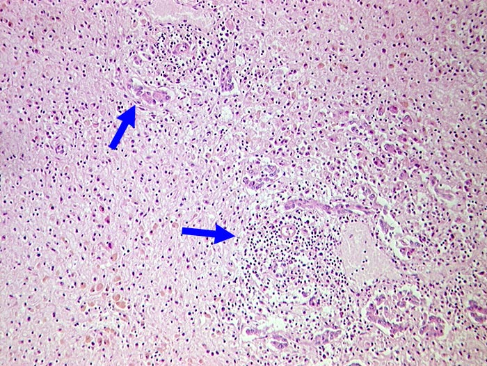 Nekrosezonen mit zeroidbeladenen Makrophagen (gelbbraun). ► Zwei Portalfelder sind durch die Nekrosen nahe aneinander gerückt. In den Portalfeldern lymphozytäres Entzündungsinfiltrat und Ductulusproliferationen. Kein vitales Leberparenchym.