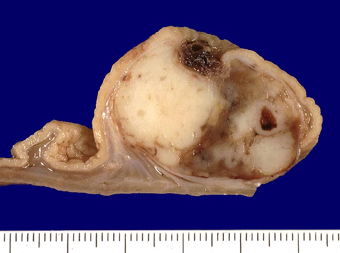 Braunweisser, scharf begrenzter Tumor in der Submukosa. Ulzeration der darüberliegenden Schleimhaut.