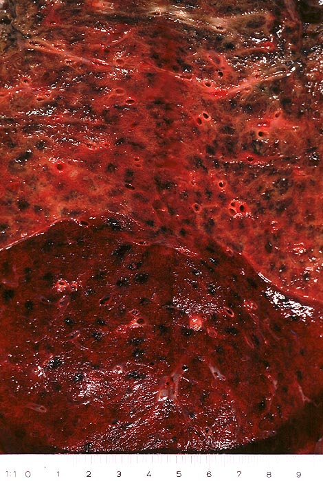 Homogene grau-rote Verfärbung des Lungenoberlappens.