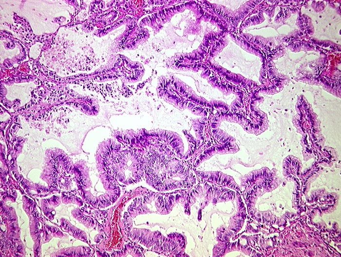 Hochzylindrische schleimbildende Zellen mit geringen Atypien tapezieren die Alveolarsepten aus. Das Lungengerüst bleibt erhalten.