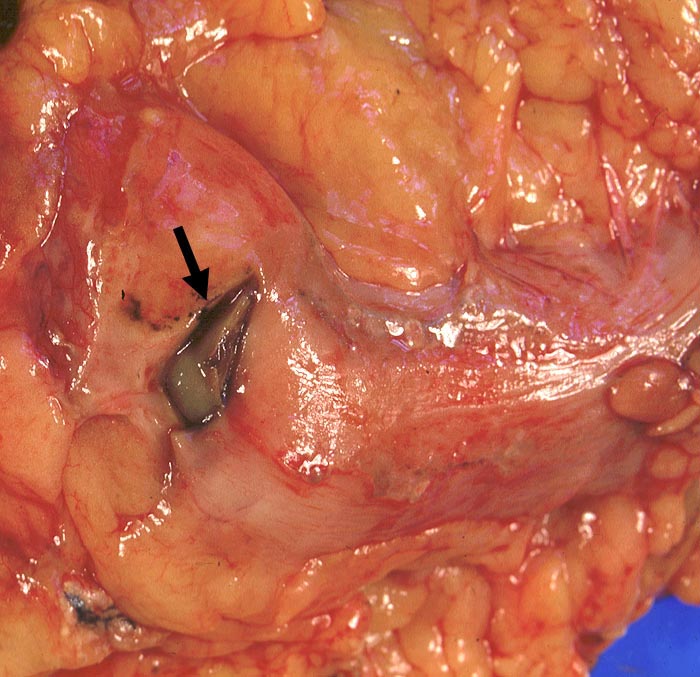 Blick auf den uneröffneten Magen. ► Grosse Perforationsstelle. Nur geringe Peritonitis (matter Serosaüberzug).