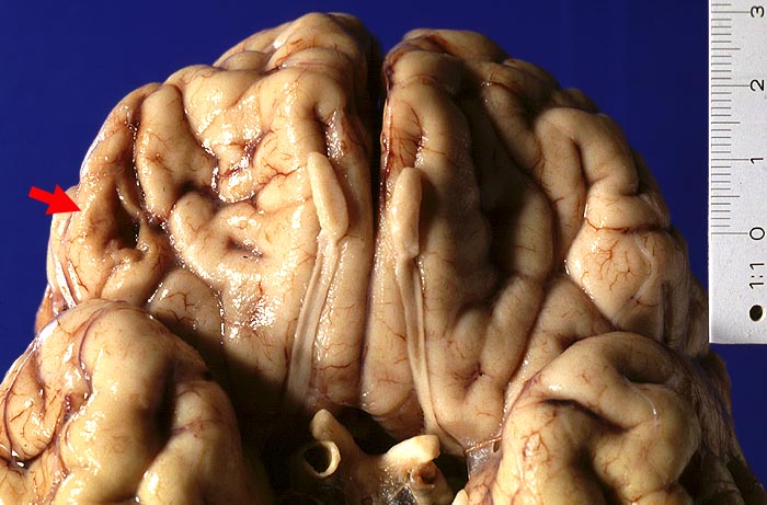 Gelblich verfärbter zystischer Defekt der frontobasalen ► Hirnrinde an typischer Stelle.