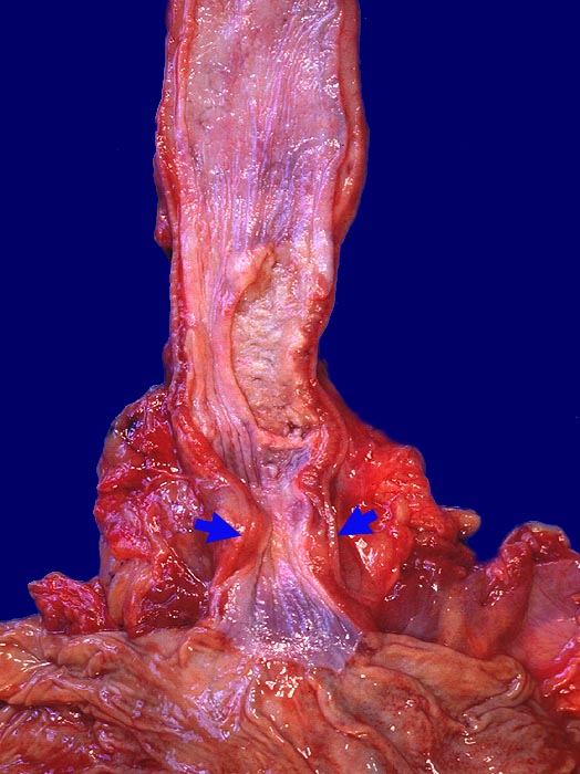 Ulkus mit verdicktem Randwall im distalen Ösophagus. Verdickung und ► Stenosierung der Ösophguswand distal des Ulkus durch submuköses Tumorwachstum.
