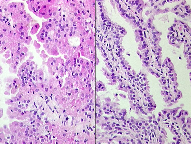 Links im Bild onkozytäre Tumorzellen mit feingranulärem eosinophilem Zytoplasma. Rechts schmale Papillen bedeckt von kubischen Tumorzellen.