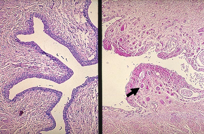 Im Vergleichsureter links sind praktisch keine Kapillaren erkennbar. Bei Analgetika-Abusus treten die ► Kapillaren als stark PAS-positive Strukturen deutlich hervor. Das umliegende Bindegewebe ist leicht sklerosiert und ebenfalls stärker PAS-positiv als im Vergleichsureter.