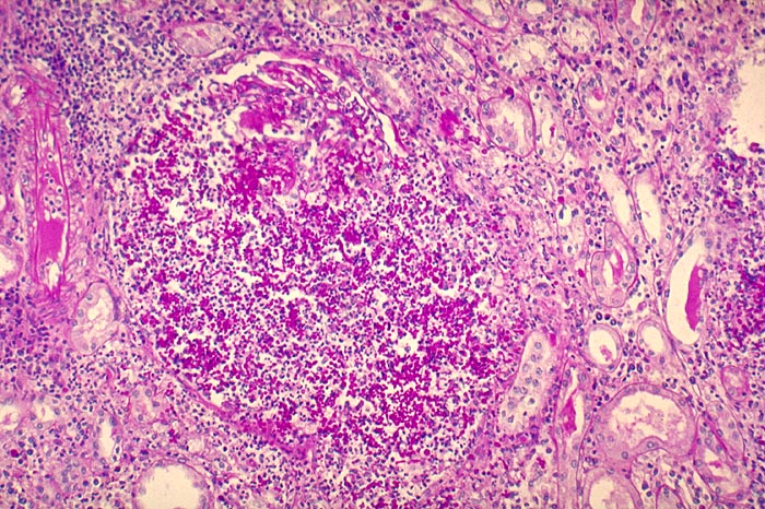 Im Zentrum pyämischer Streuherd im Glomerulus mit weitgehender Zerstörung des Glomerulus. Zwischen den Pilzhyphen dichte entzündliche Infiltration.