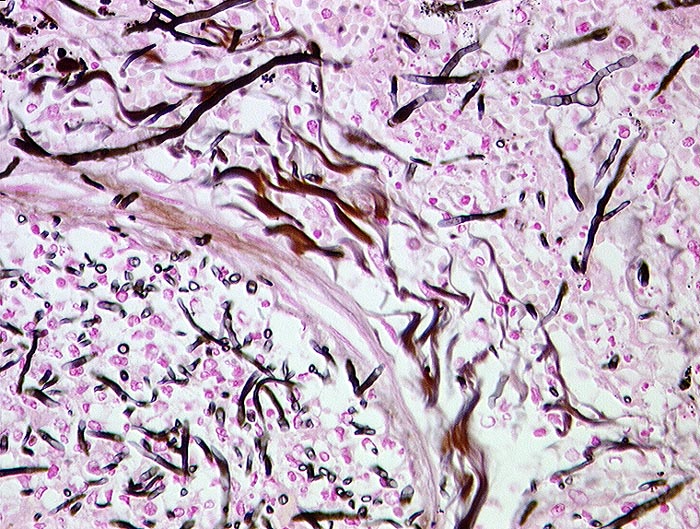 Verzweigte septierte Pilzhyphen infiltrieren die Wand eines Gefässes links im Bild.