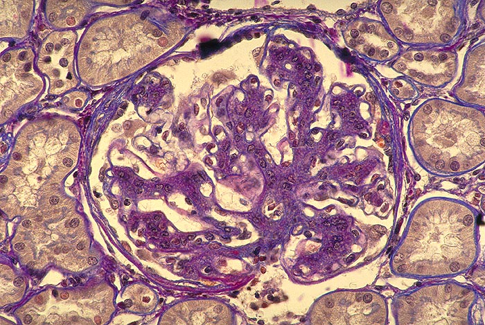 Diffuse Glomerulosklerose: progrediente Verbreiterung der glomerulären Basalmembran und des Mesangiums (ca. 2-5 Jahre nach Diabetesbeginn nachweisbar). Mesangiumverbreiterung bedingt durch Matrixzunahme anfänglich auch von leichter mesangialer Zellvermehrung begleitet. Der Schweregrad der diffusen Glomerulosklerose korreliert am besten mit klinischen Symptomen: Proteinurie, Abnahme der glomerulären Filtrationsrate.