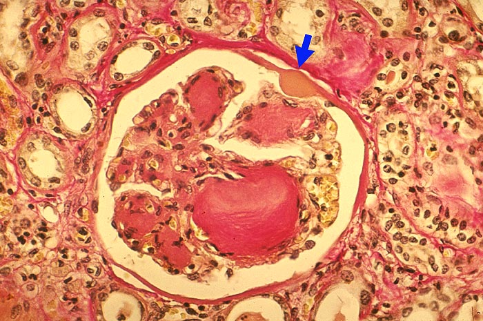 Noduläre Glomerulosklerose: Zwiebelschalenartig geschichtete, azelluläre Knoten im Mesangium. Primär leichte Hyperzellularität der Noduli. Im Allgemeinen folgt die noduläre Glomerulosklerose der diffusen Glomerulosklerose vor allem bei Typ I Diabetes. Dabei oft multiple kleine Knoten im Mesangium. Beim NIDDM gelegentlich einzelne sehr grosse Noduli mit nur wenigen Glomeruli ohne relevante diffuse Glomerulosklerose. Die noduläre Glomerulosklerose ist aber nicht einfach eine besonders schwere Form der diffusen, sondern wahrscheinlich eine unabhängige Erkrankung mit verschiedener Pathogenese.