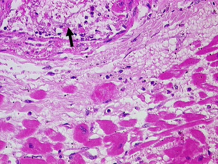 ► Aspergillushyphen in einem intramyokardialen Gefäss.