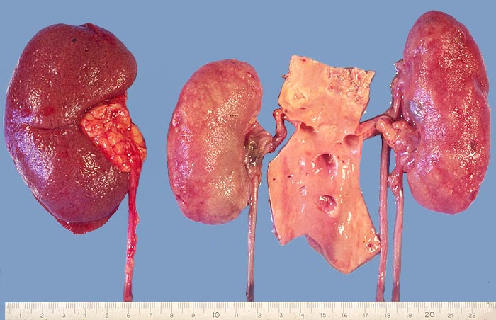 Weisse Niere mit bläulichem Unterton, fast durchsichtig (glasig), selten gummiartige Konsistenz. Sehr selten verwaschene Mark-Rinden-Grenze. Oder gelbe, unterschiedlich grosse Nieren. Nach Hämodialyse gelblich-rötliche Schrumpfniere.