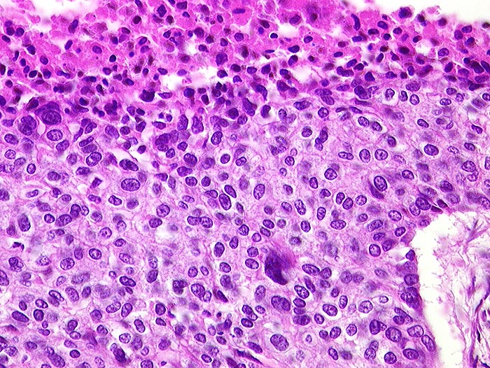 Solider Tumor mit Tumornekrose (obere Bildhälfte). Leichte Zellkernpleomorphie.