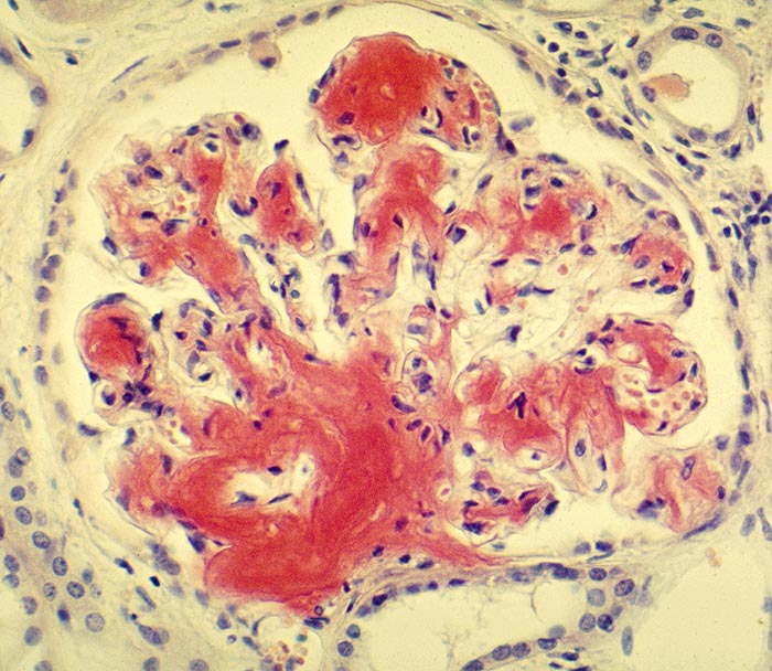 Glomeruläre Amyloidose: anfangs kleine mesangiale, gelegentlich besonders Gefässpolnahe zellfreie Amyloidablagerungen, später teilweise noduläre mesangiale Ablagerungen und Ausdehnung in die Schlingenperipherie mit Durchsetzung der Basalmembran. Schliesslich vollständige Ausfüllung der Schlingenlumina und Verödung der Glomeruli.
