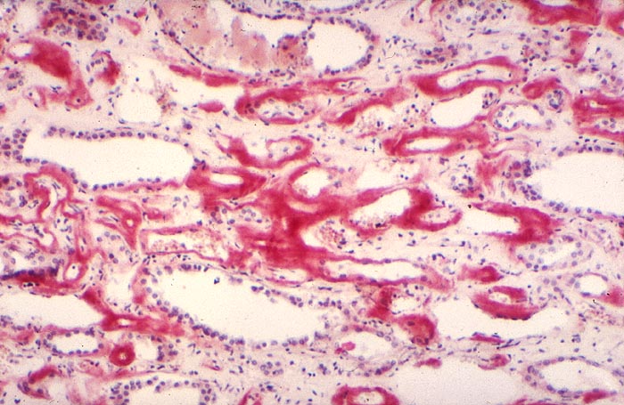 Tubulointerstitielle Amyloidose: teils kleinherdige, teils diffuse Ablagerungen entlang der tubulären Basalmembranen, besonders von Henle'Schleifen und Sammelrohren. Daneben auch im Interstitium und entlang peritubulärer Kapillaren und der Vasa recta.
