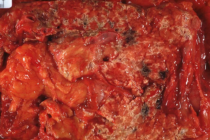Ausgedehnte frische fleckförmige Nekrosen des Pankreasparenchyms und des angrenzenden Fettgewebes.
