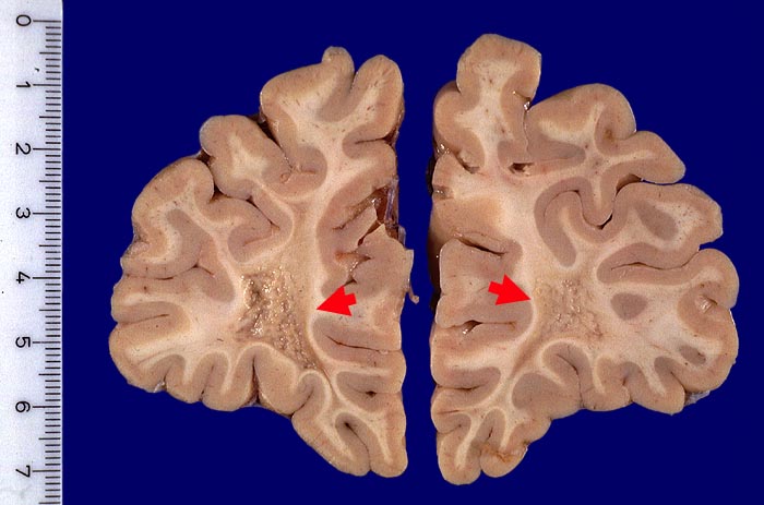 Grau verfärbte und eingesunkene Areale mit granulärer Oberfläche im frontalen Marklager beidseits.