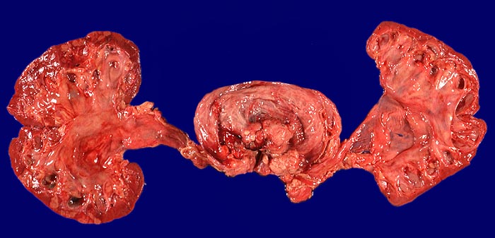 Ausgedehnte Tumorinfiltrate mit Infiltration der Harnblase mit Stenosierung der Urethra und beider Ureteren. Ureteren und Nierenbecken beidseits sind stark ausgeweitet. Die Nierenrinde ist teilweise verschmälert.