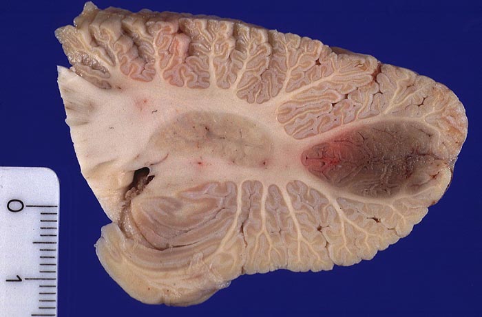 Umschriebenes graubraun verfärbtes Areal in der Kleinhirnrinde (formalinfixiert).