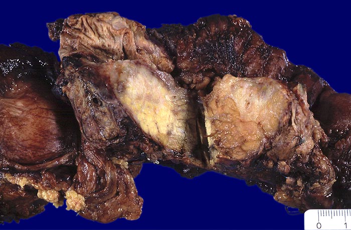 Schnittfläche durch Pankreasteilstück. Im Bereich des Pankreaskopfes ein weisser Tumorherd. Uebriges Pankreasgewebe distal davon fein lobuliert, beige