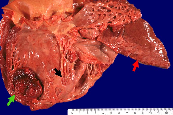 Myokardinfarktnarbe der ► Hinterwand, ► der Vorderwand und des Septums (14x8cm). Thrombosiertes Herzwandaneurysma des ► Septums (4x8cm)im Bereich der Narbe. Abrundung der Herzspitze und Vergrösserung des Herzens (exzentrische Hypertrophie).