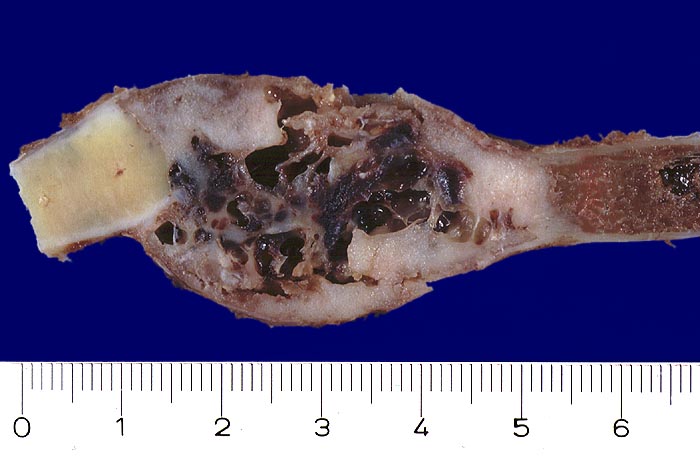 Vollständige Zerstörung des Knochens durch weisses Tumorgewebe im Randbereich. Im Zentrum die aus mehreren Zysten mit Einblutungen bestehende sekundäre aneurysmatische Knochenzyste.