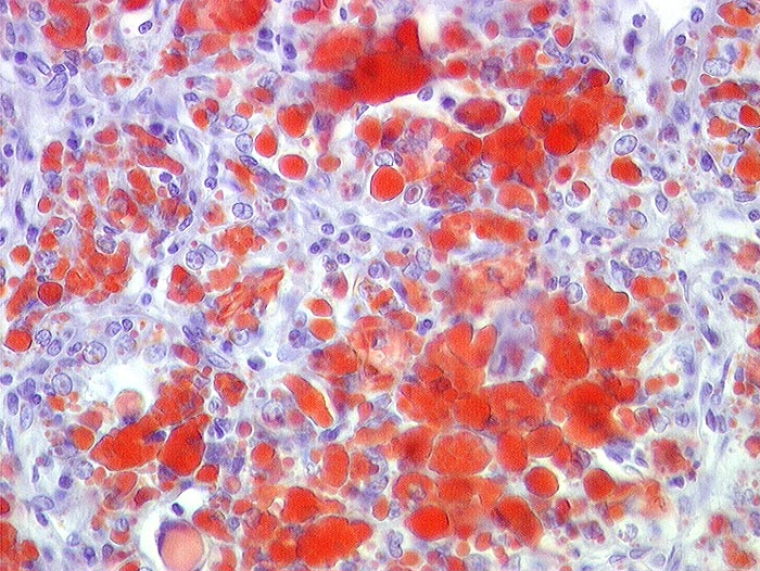 Mit Sudanrot angefärbte intrazelluläre Lipidtropfen in einem hellzelligen Nierenzellkarzinom