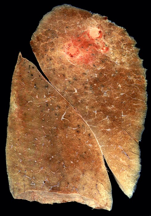 Zwei scharf begrenzte weisse Rundherde im linken Lungenoberlappen umgeben von einem hämorrhagischen Randsaum.