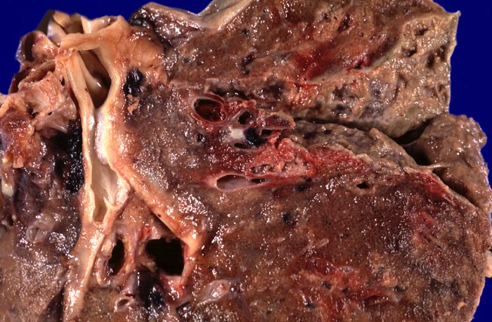 Lungenschnittfläche formalinfixiert. Blick auf die eröffnete Abszesshöhle. Schmutzig graue Auflagerungen von nekrotischem Material und Eiter in der Abszesshöhle. Der Abszess ist frisch und zeigt noch keine bindegewebige Abkapselung.