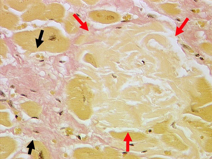 Scholliges azelluläres ► Amyloid zwischen den Myokardfasern. Daneben ► feinfleckige Fibrose.