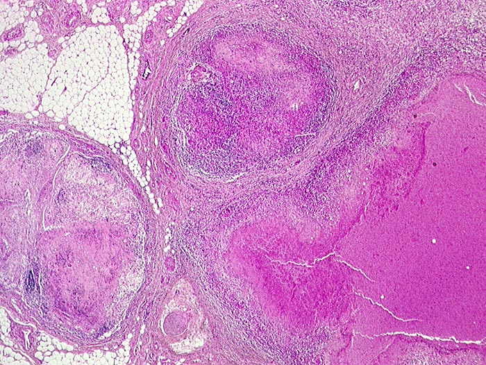 Ausgedehnte käsige Nekroseherde in mesenterialen Lymphknoten.