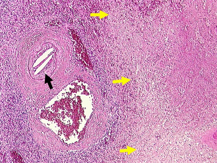 Durch die Fixation herausgelöste ► Cholesterinkristalle sind als wetzsteinförmige Hohlräume im Gefässlumen sichtbar. ► Frischer Milzinfarkt.
