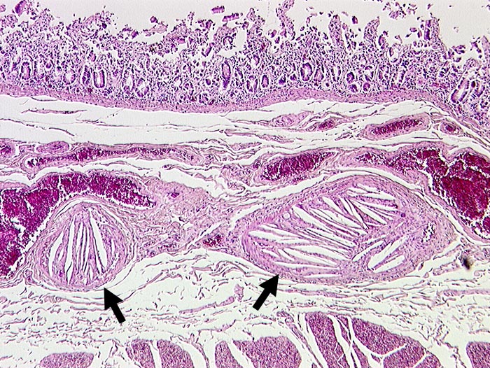 Organisierte wetzsteinförmige ► Cholesterinkristalle in submukösen Arterien.