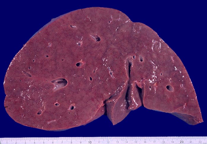 Das makroskopische Bild bei einer nicht fulminant verlaufenden akuten Virushepatitis ist uncharakteristisch. Die Leber ist gross und rot. Entzündung und Einzelzellnekrosen werden makroskopisch nicht sichtbar.