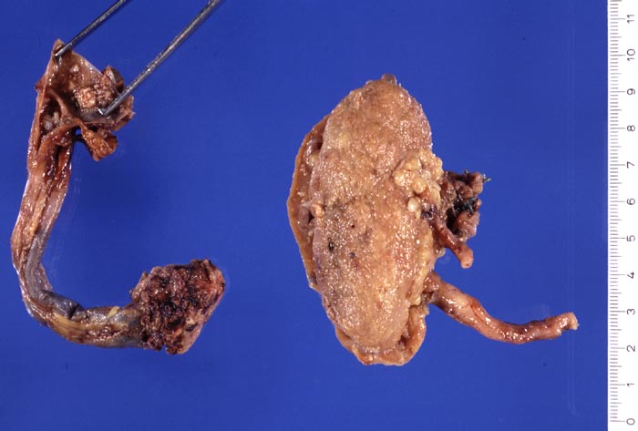 Blasse Schrumpfniere mit granulierter Oberfläche. Im Ureter ein papilläres Karzinom.