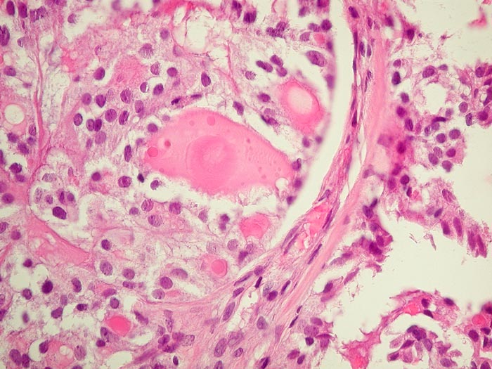 Die Tumorzellen reagieren positiv mit Thyreoglobulin sowie mit dem nukleären Transkriptionsfaktor TTF-1