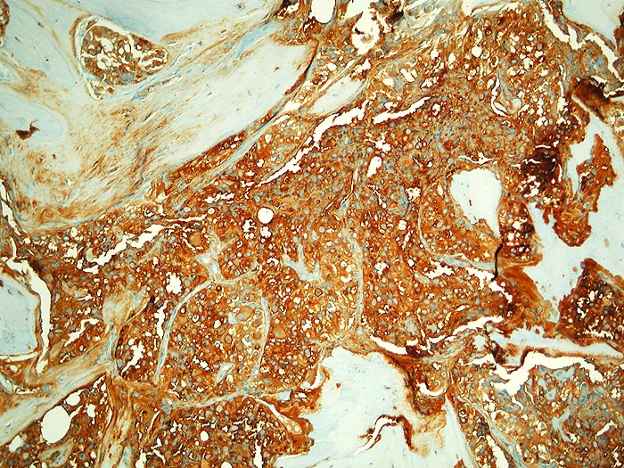 Die malignen Zellen reagieren stark mit Thyreoglobulin.
