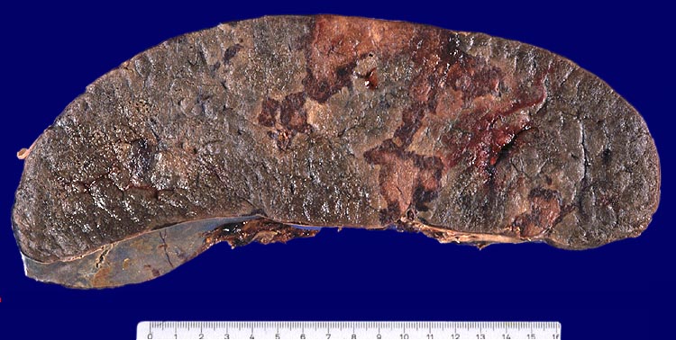 Massiv vergrösserte formalinfixierte Milz mit frischen landkartenförmigen Infarkten mit hämorrhagischem Randsaum.
