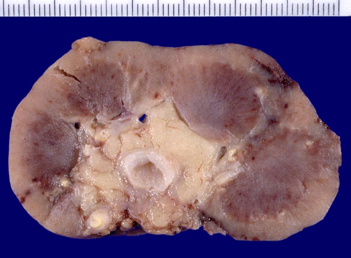 Hellbraune Nierenrinde mit punktförmigen Hämorrhagien. Am meisten Petechien finden sich im Bereich der Columnae renales. Nierenmark teils unscharf von der Rinde abgegrenzt. Papillen erhalten. Im Nierenbeckenfettgewebe zahlreiche Gefässanschnitte erkennbar mit stark eingeengten Lumina.