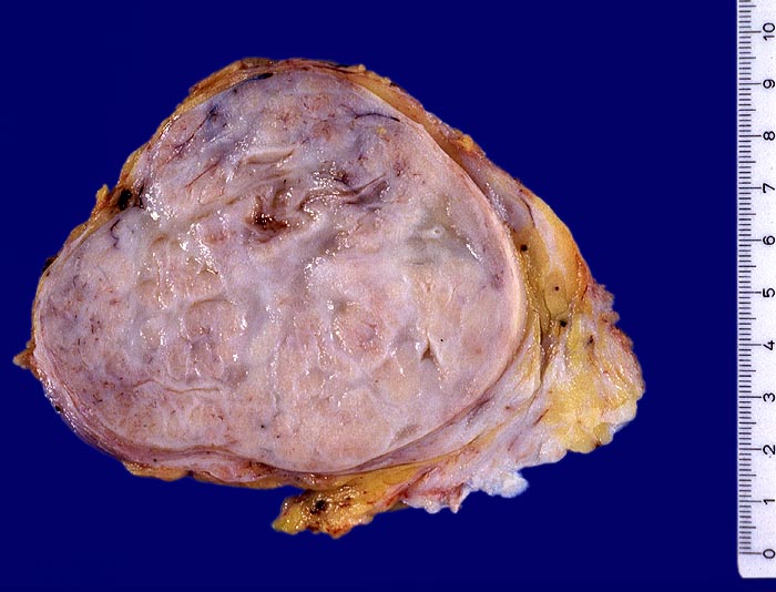 Scharf begrenzter Knoten mit lobulierter grauweisser Schnittfläche mit verzweigten Spaltbildungen (Drüsenlumina).